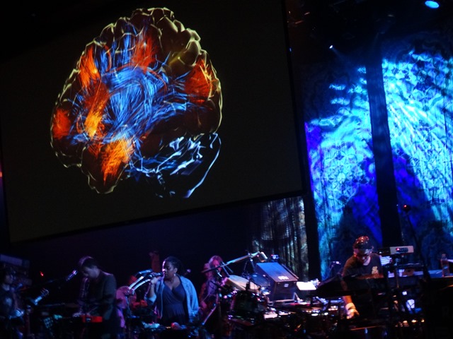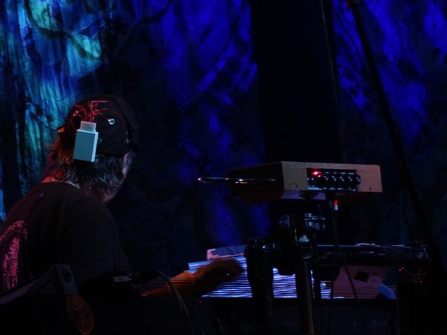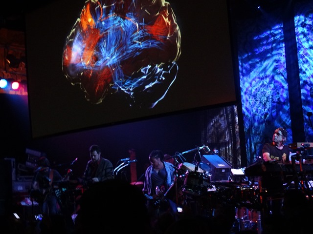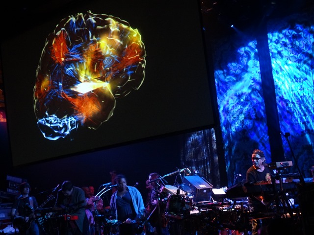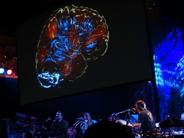 Mickey with his EEG cap transmitting his brain onto the screen at the House of Blues. MORE SHOW/ BAND PICS HERE